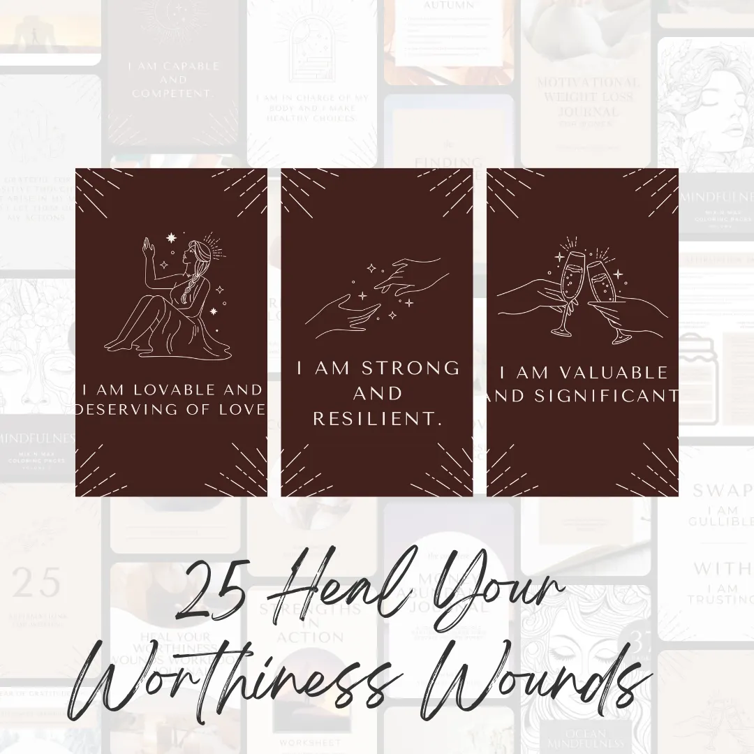 Guide clients in self-healing with affirmations. This resource focuses on affirmations tailored to address worthiness wounds, fostering a positive self-perception and emotional well-being.